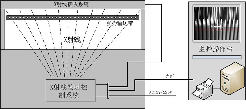 采用X射線透視原理,通過X射線發射器產生X射線穿透被檢測皮帶,X射線接收器接受X射線發射器發出的X射線并經過AD轉換器轉換成數據信號,然后通過數據線傳送到X射線發射箱,發射箱將傳來的數據經過壓縮處理、調制成光信號,通過光纖傳送到地面光轉換模塊將檢測到的皮帶數據存儲于上位計算機上做實時的檢測與安全評估。